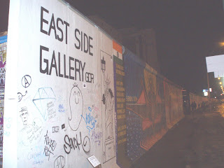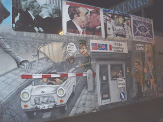 Dalje nas naš vodič Berry vodi do Hitlerovog bunkera, u kojem se zadnje skrivao skroz do svoje smrti, i koji je danas zatvoren pod zemljom a iznad se nalazi parking, šteta što se ne može tamo zavirit. Dalje smo obišli bivšu kasarnu za više od 2000 oficira na kojoj je sačuvan socijalistički orijentirani mural, nama odavno poznata spika tipa veseli nadobudni radnici, slave sa zastavama, dječica trčkaraju a Anka Partizanka drži govor. Uglavnom ta je kasarna ostala jedina cijela za vrijeme bombardiranja Berlina unatoč svojoj veličini. Napokon dolazimo do zida, komad duljine stotinjak metara, simbol podijeljenog a danas slobodnog Berlina. Niš posebno- zid, ali Berry nam veže zanimljive priče uz to i uz ljude koji su život izgubili pokušavajući ga prijeći. dalje idemo do check point Charlija, najpoznatije check point točke između istočnog dijela i zapadnog dijela u američkom sektoru. Opet niš posebno, baraka koju su naknadno napravili i kod koje paradira ekipa u uniformama i ostali se naslikavaju. Jedino su zanimljive ogromne fotografije po ogradi koje prikazuju stare slike Berlina.