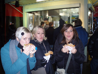 Skroz zadovoljni kaj smo ga upoznali odlazimo potražit neko mjesto za shopping, i za klopu, tražili smo onu KU-dam ulicu al nam nitko nije znao objasnit, napokon nas je neka cura skužila kaj hoćemo al nas je uputila puno bliže u Alexu, ogromni shopping centar na Alexsanderplatzu, njega je bar lako naći prema onom televizijskom tornju. Taman prije shoppinga naletimo na neke hrenovke od pol metra sa senfom tak ljutim da su burkiju sve suze frcale kad je potegnuo. Za shopping nam je trebalo jedno 2 sata taman do zatvaranja, lagano natrpani odlazimo podzemnom, prema Prenzlauer bergu. Lagano se šveramo u podzemnoj na foru, nismo znali da treba cvikat kartu, meni lagano nervoza ali duram. Na Prenzlauer bergu uletavamo u neki kineski take away, i ko pravi klošari sjedamo na klupice na svoje shopping vrećice i gablamo u društvu jednog miša i uživamo i uopće nas ne jebe kiša koja nemilice pada. I sve to lijepo zaljevamo jednim pivkanom. Neizmjerna sreća. Tek sad mirno možemo otići u neku birtiju na cugu, nalazimo neko zgodno mjesto i uvaljujemo se, burki na pšeničnu pivu a ja na koktele. S ekipom se nismo uspjeli naći jer smo bili na drugom kraju grada ali i oni su se dobro proveli u nekom turskom restoranu. Nakon dva koktela lagano shrvani sjedamo na podzemnu, koja vikendom vozi cijelu noć i vraćamo se u svoj lijepi hostečić na hrkanje.