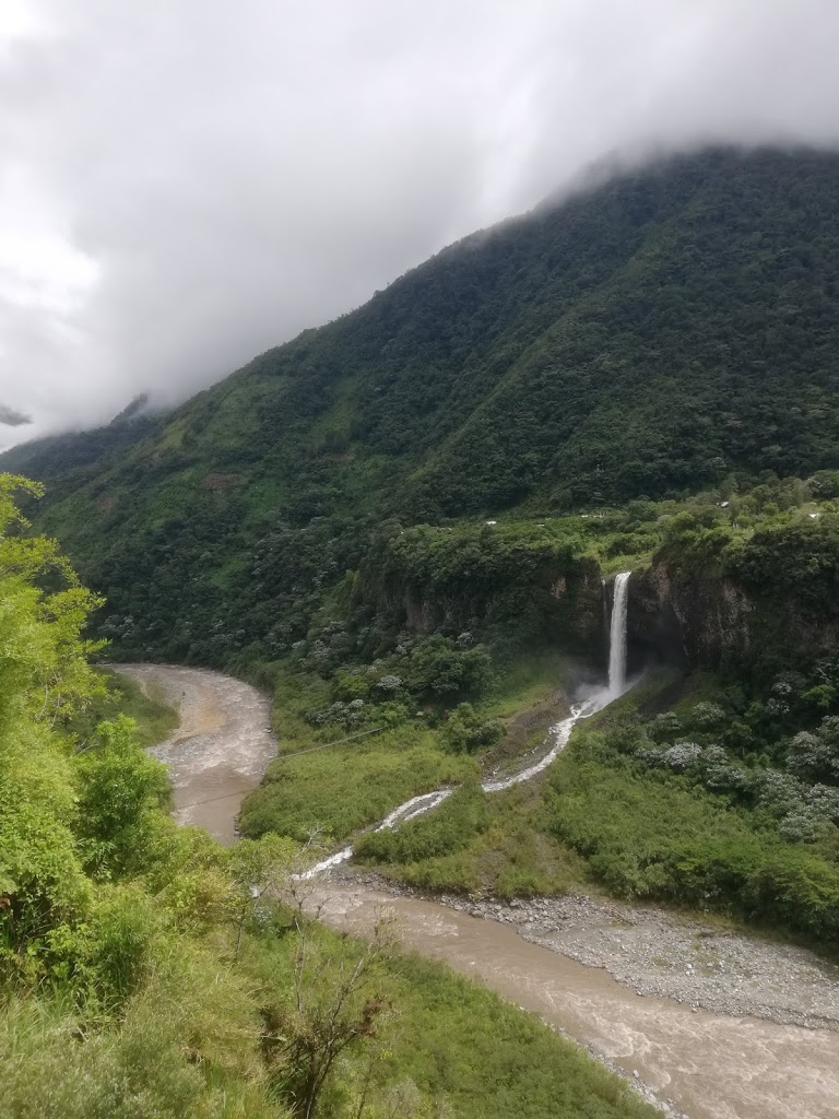al ne zadugo, puknuo mi je lanac nakon brane i ne mogu ga složiti sama. Srećom zaustavljaju se dva gospona na bajkovima da mi pomognu ali ni oni to ne mogu složiti pa mi sa svog ekvadorskog moba zovu agenciju da dođe s drugim biciklom. Za nepovjerovati ali ovi dolaze brzo i moja se avantura nastavlja. Krajolik je fenomenalan, zelene šume i proplanci, plantaže naranča i limete na obrocima, a u kanjonu kraj ceste rijeka u koju se obrušavaju svakih par kilometara manji i veći vodopadi. Cesta kojom vozim je prometna ali izgleda da su vozači navikli na bicikliste uz rub. Stalno su tuneli na cesti ja prolazim kroz jedan tunel, a drugi tuneli imaju obilaznicu za bicikliste, koja omogućuje još bolji pogled na vodopade.