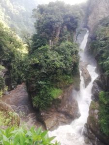 Malo je vrijeme šugavo, puše i paducka neka kišica, a ja se u kratkim hlačama uporno nadam da će proviriti sunce. Svaki čas se zaustavljam nekaj poslikati jer je priroda prekrasna, prvi veći vodopad na kojem bacam fotosešn je Agoyan, onda ide par manjih pa opet jedan veliliki Cascada Manto de la Novia. Tamo stajem u nekom restorančiću gdje poslužuju pastrve ali ne ručam već samo pijem čaj i uživam u pogledu. Uskoro bih trebala stići do najvećeg vodopada koji je i highlight ove ture El Pailon del Diablo. Do njega se spuštam stepenicama i puteljkom na drugom ulazu, vidim ga već malo kroz krošnje drveća i čujem tutnjavu vode, a onda stižem i ostajem zapanjena tom silom prirode, ogroman vodopad, niz koji se slijeva podivljala i neobuzdana bujica vode, koja se pri dnu raspršuje u gusti oblak. Voda šprica na sve strane, to me ne zaustavlja već idem što bliže da potpuno doživim svu silnu snagu vode koja divlja, mokra sam ko miš, al se provlačim skroz kroz stijene da dođem ispod vodopada. Užitak je neopisiv, ispod vodopada sam, valjda trebam zaželiti neku želju!!!!