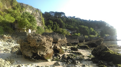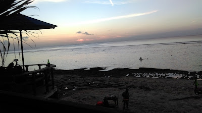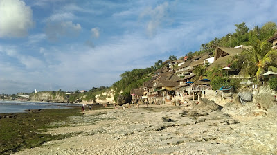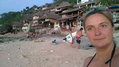 Wayan je super simpa lik, mali, dugokosi rudlavi, vesele naravi, bavi se rentanje, ima 4.sobe s kupaonom, surfer, vrlo ljubazan. Upozora nas da ima domace zivotinje, a ja mu velim da je to nama bas super, biti na selu a ne po resortima koji su svi isti. Selo Bingin se nalazi na jugu Balija, koji se zove Bukit. Sobe su uredne, ciste, jednostavne i lijepe, posteljina fino mirisi, a kupaona mu je pravi piece of art, tus s otvorenim krovom, i biljke koje rastu kao ukras. Odusevljeni smo i s Wayanom, i njegovom zenom i našom sobom, a i dvorištem u kojema piceki i kravice pasu okolo. Bacamo ruksake i odmah kidamo precicom moju nam je pokazao do Impossible beach, citala sam jedne od skrivenih, prekrasnih plaza za surfere. Selo je na klifu pa se spustamo stepenicama do mora…kad ono od mora ni m. Oseka je, more se povuklo, samo greben…nastavljamo po plicaku prema drugoj plazi, Bingin beach…tamo se moze kupati u malim bazenima izmedju grebena, al kad se more digne, plaza se smanji ali barem se moze kupati. Na rubu grebena su surferi, cekaju dobar val da ga zajasu….prekrasan prizor. Uz plazu, po klifu su restorani, Warung se zovu mali obiteljski restorani, i kafici, svi imaju prekrasan pogled na ocean, surfere i zalazak sunca. Znaci to je to, Bali, tropski raj, opustena atmosfera, valovi i surferi, prekrasni zalasci sunca…mogao bi mi se trajno uvuci pod kozu, vec popustaju kocnice, usporavam ritam i prepustam se laganoj atmosferi i uzitcima.