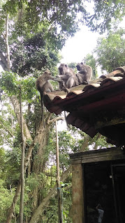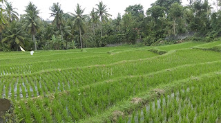 Vozikamo se po ulicama, došli smo do Monkey forest, sume majmuna, velikog parka prepunog zelenila i makaki majmuna. Ne ulazimo unutra nego samo malo slikamo majmune. Dosli smo i do rijeke gdje su se skupili neki hodočasnici koji su spuštali darove niz rijeku u onim malim pletenim košaricama koje stavljaju pred svaku kucu. Na kraju smo otplahutali do dijela koji se zove neki ridge, ugl. tamo su beskrajne rizžne terase i lijepo je za šetnju. Vrijeme nam je da vratimo skuter, tipa naravno nema, pa idemo po ruksake i pojest nekaj kod neke tete na štand di smo vidjeli da je guzva, opet neka varijanta rize. Topim se polako od ovakve klope.