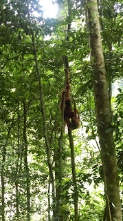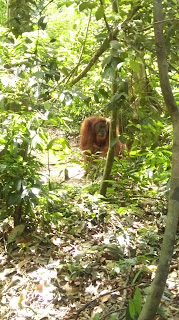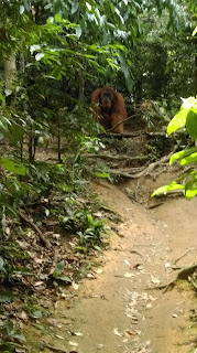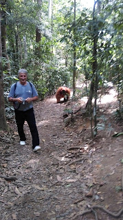 - Idemo dalje kroz sumu..i opet jedna zenka s mladim, ali ovaj prizor njeznosti i ljubavi je nenadmasan. Igraju se, grle, maze, maleni skace po njoj, ona ga ljulja, grli…predivni su. Sjedim i uzivam ih gledati, kad odjednom komesanje, i vice vodic bjezmo ide veliki orangutan. Svi se rastrcali, a po stazi za njima on, visok oko metar i po..duge ruke, ogroman, preko 100ckila sigurno. Meni noge pocele klecat od straha…jer on ide za nama, nemas mu kamo pobjeci. Ioak je u nekom trenutku popeo se na drvo, pa sam se malo smirila.