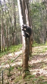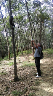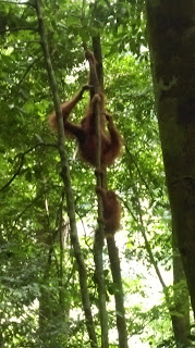- Jedva otvaram oci u pol 8, prva noc na krevetu, jos smo strgani i krmeljavi al ubrzavamo ritam jer u 9 imamo jungle track. Trazimo neku domacu klopicu za dorucak i biramo kod neke tete juhicu s noodlsima, neko przeno povrce i banane u tijestu sa strane, mislim da se juhica zove Mae ayan..al morala bum provjerit, nikak da upamtim. Napucali smo se temeljito, popili i kavicu, kupili jos hrpu banana i vodu i to sve za 20kn. U 9 dolazi nas vodic Rozi, ima ime ko curica al je simpa. Idemo nas dvoje solo i on. Put do parka ide kroz plantaze kaucukovca, i vec na drvecu kaucukovca nalecemo na Tomson leaf monkey…hrane se liscem i plodovima kaucukovca, sivi sa bijelim trbuhom, njih smo jucer vidjeli u selu. Ulazimo u nacionalni park, vegetacija se odmah mijenja, puno je gusce, i suma je bujnija. Vrlo brzo vidimo ekipu kako se skuplja oko drveta a na njemu majka orangutan i beba, hrane se, ona je mirna i sjedi a mali skace okolo. Dosta su daleko ali prizor je lijep. Steta je sto nismo sami..dosta je ljudi koji dolaze s vodicima u grupicama. Ja imam banane u torbi za svaki slucaj…ak bu kakva situacija…znam da ih je bolje ne hraniti ali kako da odolim ako dodje blizu.