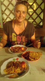 - Uspijevam se dici tek kad vec pada mrak, bacim jos jedan swim u rijeci i najebem starog da idemo u restoran na kraju sela na ulazu u prasumu. Jedemo stalno po tim lokalnim restorancicima, zapravo kucama, i bas mi se sjelo negdje di nisu plasticni stolci…i di je lijep pogled, iako je mrak. Biram jedan lijepi restoran, tradicionalni indonezijski, s namjestajem od drva, ukrasima i lijepim vrtom. Klopamo Nasi goreg i Mae goreg, jednu pivicu maznemo po pola, chillamo i lagano natrag na spavanje. Za sutra nemamo nikakvih planova…sve u hodu.