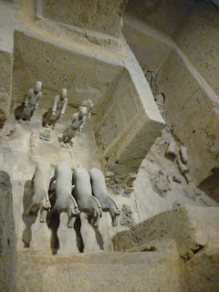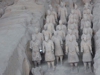 Muzej se sastoji od 3 iskopine, prva je najveca i to je ono sto sam vidjela na slikama, vojska ratnika i koja koji stoje u redovima. Otkrio ih je neki farmer kad je kopao bunar, i danas su pod zastitom UNESCOa, a Kinezi vele da im je ovo 8 cudo svijeta. al to pise i na Kineskom zidu pa im nije za vjerovat. Potjecu iz vremena dinastije Qin, i nalaze se u blizini grobnice cara Qin Shihuanga. Ima oko 6ooo ratnika i konja, svi izradjeni u prirodnoj velicini, svaki razlicit, i bili su obojani raznim bojama ali one su u kontaktu sa zrakom apsisale, pa su danas svi otkopani ratnici smedji, boje teracote. Jos ih je puno ispod zemlje i jos se kopaju iako sam negdje citala da su stali s kopanjem dok ne nadju neku tehniku da zastite boje. Svaki je u ruci imao oruzje, i neki stoje a neki klece. Uglavnom ova prva iskopina je najjaca, u 2 i 3 je puno manje vojnika, a super su jos i u muzeju 2 kocije sa konjima i kocijasem od bronce koje su restaurirali 8 godina. Nakon dva sata razgledavanja idem prema busu, mrknem kod neke babe uz cestu neki pusti kineski sendvic i vracam se u grad. Pozalila sam zbog sendvica jer je zenska tak lose vozila bus, stalno je cukala, gas pa makne nogu, najradije bi joj stisnula nogu na gas i rekla odjebi i vozi ili cu ti se zbljuvat za vrat. Jedva sam docekala da stignem u Xian.