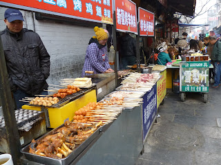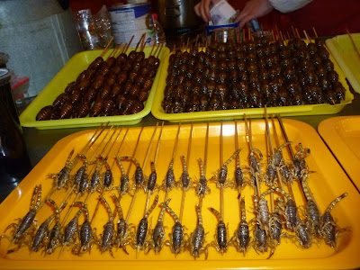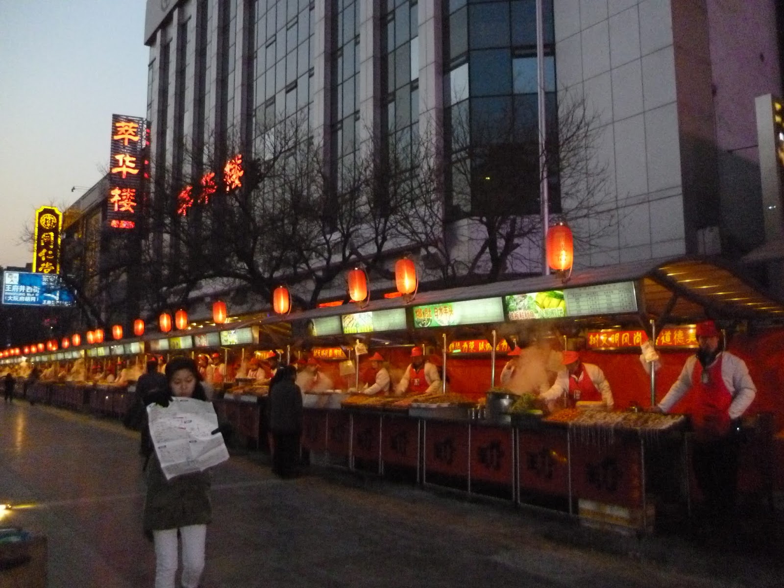 Pjeske smo se uputile prema ulici Wangfujung, punoj ducana i koja na kraju i pocetku ima standove sa hranom, al u ovom slucaju uglavnom uvrnutim menijem. Na raznjicu mozes probati: zmije, paukove, morske zvijezde, morske konjice(to mi vjera ne dozvoljava), skorpione, crve, stonoge, dudovog svilca iliti velikog zohara, skakavce, morske krastavce, male ptice…ubih se od nabrajanja… hrpa cudnih jela. Ja sam se odlucila probati crve i dudovog svilca, iako mi je neka zenska preporucila pauka kojeg je rekla da je jela jucer i da je super za razliku od zmije koja joj nije dobra bila. Serale smo klopu i probale uvrnute specijalitete…Crvi su bili super, ali zohari…jedva sam ih progutala… jos mi se sad malo digne zeludac kad ih se sjetim. Ali nije nejestivo. Mozda sutra odem probat pauka.