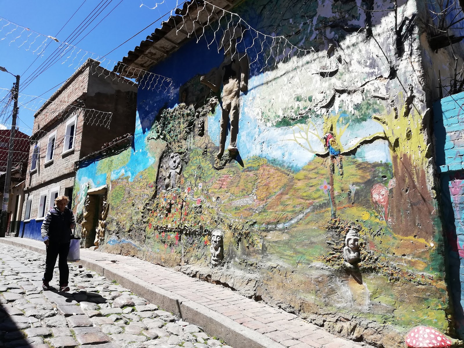 Zanimljiv dio ture je bila priča o Chichi, to je neko lokalno alkoholno piće koje se dobiva iz kukuruza, odmah sam maknula jednu chichu sa sokom od manga, i nije loša za jeftini alkohol. Prošli smo i  trg Plazoleta Chorro de Quedo s malom crkvicom Ermitra de San Miquel de principe koji je meni nekak najbolje sjeo i uličice okolo, tu se skuplja ekipa i chilla na trgiću ili cuga chichu po birtijicama iz kojih se čuje salsa. To je inače i najstariji dio Bogote oko kokeg je sve nastalo, srce grada. Tam sam i navečer završila na još jednoj chichi. Ono što me ful oduševilo su grafiti. Grad je pun grafita, murala, reljefa koji su prava umjetnost. Šarene kuće i grafiti, salsa koja se čuje iz svake birtije čine grad još veselijim. Baš mi se svidjela ta živost, muving, kolonijalna arhitektura, zgodne birtijice, lijepo mi je sjela Bogota.