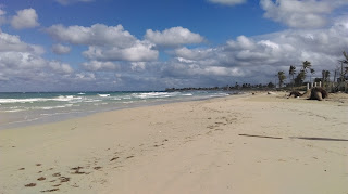 Naletim usput na neke hambyje koje prodaju za 10 pesosa, ili 3 kn, i sok za 1 peso, i još maznem onaj sladoled iz aparata, za 2 pesosa…uglavnom gablec za 4 kn samo takav…kakva bagatela, hrana ukusna a djabe. Bojim se da ne bum dosla s 4 kg manje kao inače s puta. Malo šetam još kroz park Fraternidad, idem prema Stazione Cental, ili glavnom željezničkom kolodvoru, oko parka su uglavnom palače a putem do stanice kolonijalne zgrade, slične onima u mom kvartu ali malo bolje. I stanicu obnavljaju pa su skele okolo, i par starih lokomotiva koje slikam. Oko stanice su busevi i pick up kamioni koji cekaju da se napune pa voze ekipu okolo. Zasprehava me neka curka da probam njen mojito, a kak me već noge bole odlučim ga popit kod nje, moj prvi mojito u Havanu, i bome je dobar, ali i jak. Malo s tom curkom i njenom frendicom pričam, dok sjedimo na štokrlima pred birtijicom. Objasnila mi je gdje stoji bus za plažu i uputila me da odem na Guanabo plažu, to je vise za lokalce, ima birtijice i restorane lokalne za razliku od Sta Marie na kojoj su resorti. Odluka je pala, dosta lutanja po gradu, sad je plaža na redu. Bus A40 ili 400 dolazi brzo, i vec se vozim prema Guanabu, pitomom mjestašcu na samoj plaži…i stvarno je puno malih paladares restorana, kioska s hranom, štandova sa suvenirima.