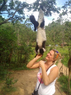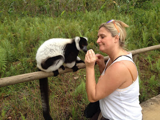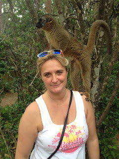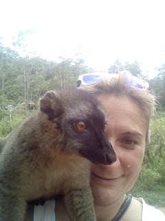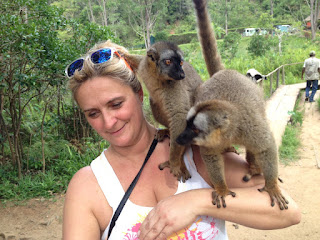 E tome sam se najvise veselila…druzenju s lemurima…da osjetim njihove rukice po licu, nakon sto cackaju po svojoj riti:). I tu je ulaznica poskupila na 25000 arija sa 15000 al ovo je must see. Vakona reserve je privatni reservat sa prekrasnim hotelom i raznim sadrzajima, novenje je 65 eura i daleko je od sela po zajebanoj cesti tak da nismo to rezervirale. Cuvar nas vozi kanuom 5 metara do otoka lemura, uci nas da ne radimo nagle pokrete i daje nam banane da ih hranimo. Odmah nam skacu na rame, diraju nas rukicama, drze za glavu, zicaju klopu, Slajki je njen slozio novi friz. To su smedji lemuri, imaju i crno bijele koji vise s grane naopacke i rijetko dodju na rame, imaju neke male lemurice koji su plahi. Imaju i sifake al na drugom otocicu i njih mozes samo gledat izdaleka. Ove smedje bitange skacu po meni ko da sam grana, a ja uzivam. Preslatki su, i puno manje agresivni od majmuna, a rucice su im skroz fora.