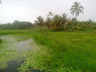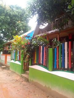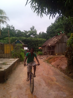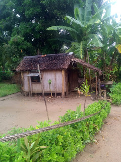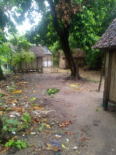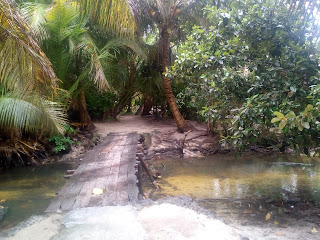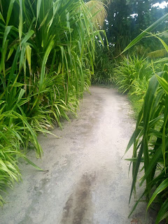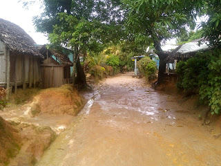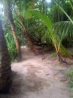 Lije ko iz kabla, malo se smiri pa opet pljusak i tako cijelo jutro. Nis me to ne smeta, doruckujemo, blejim u ocean, gledam kisu i uzivam. Malo se smirilo iza 10 pa smo digle sidro i hrabro s kisobranima, nkrcale se bombonima i lizaljkama i krenule u istrazivanje otoka a cilj nam je glavno selo. Nema ceste samo neki utabani puteljci, oko njih vakona tree i oalme, tu i tamo neka kucica i straznje strane resorta iz kojih tutnje agregati. Rekli su nam pola sata do sela al nekak su stazice postale sve uze pa smo odlucile pitat. Uspjele smo ulovit dobar smjer, prosle kraj polja rize, i ugledale prve kuce.
