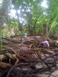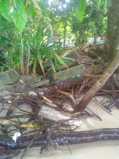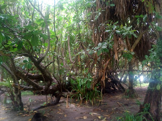 Odjednom nekaj pocne padat s drveta, frajer bere mango i baca na put, pitamo ga jel mozemo uzet kojo, on se nasmije i kimne, skuzila je Slajka klince kak ga zubima nacnu i gule ko narancu…i odmah smo maznule par. Taman frajer susao s drveta pa smo kupile jos. Sad smo mi sretnr ko ova djrca. Toliko smo se htjele iznajest manga, a nikak da nam se to ostvari, i sad ga jedemo netom ubranog, gulimo zubima, i cijedi nam se slatki sok po rukama, pa ne moze biti bolje od toga. Prosli smo napokon na drugu stranu otoka, podijelile sve slatkise oprale musave noge u moru i razisle se, Slajka prema nasem hotelu a ja na onu plazu na rubu otoka, najljepsu plazu koju sam ikad vidjela u zivotu. Plivam po tirkizno zelenom moru, valjuskam se po bijelom pijesku, jedem banane i mango i uzivam ko prasence. Jedini je zajeb s tom plazom groblje koje je pored pa je malo spuky. Uzimam fotic i idem blize s moraske strane poslikat, kad ono valovi razvalili nekih desetak grobova najblizih moru, prazne kamene kadice, neka odjeca po korijenju drveca, okinem dve slikice i ukenjam se od straha, da mi ne dopluta neciji koska ili da ne stanem na neku lubanju u pijesku…ufff…onak mi žmefko, frkica…al ona ljepota i milina brisu strah i opet uzivam, al ne idem vise dalje od jedne palme, da nisam preblizu.