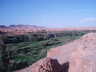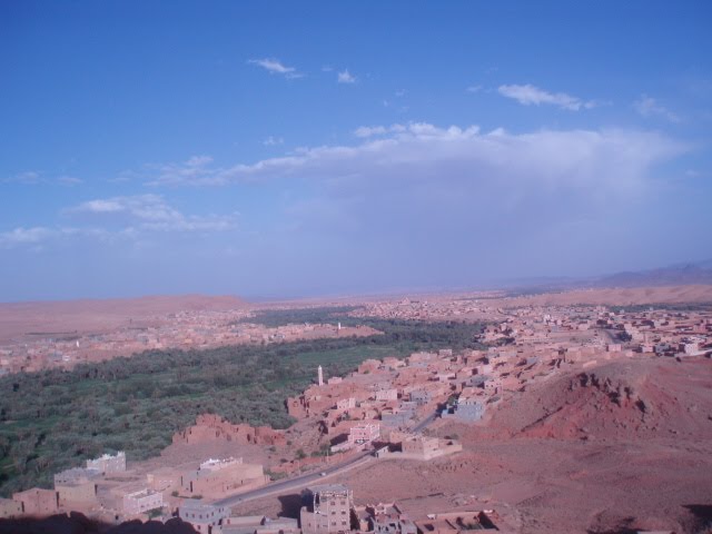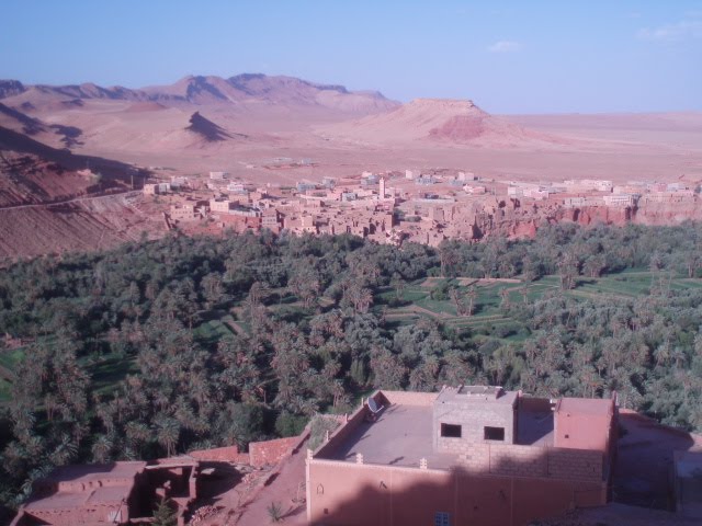 Kraj preko kojeg smo prolazili je fenomenalan, prvo put ide preko visokog Atlasa, kroz prijevoj Tizin Ticka, na par 1000 mnv, izmjenjuju se berberska sela i oaze, a put je prilično nezgodan-zavoj na zavoju. Srećom sam to preživjela. Prvo duže stajanje imali smo u Ait Benhaddou naselju kasbah uz rijeku Quarzazate, koje je pod zaštitom UNESCOa građeno od gline i blata i odlično sačuvano, tamo su snimali neke poznate filmove(Gladijajatora). Jedva sam se vukla uličicama te stare kasbe, do vrha naselja.Čini se da nema puno ljudi u starom dijelu, uglavnom trgovci, i jedna mačka. S vrha se pruža pogled na presušeno korito rijeke i novi dio kasbe i na kulise za neki film koje postavljaju u podnožju. Nakon kasbe predahnuli smo u Quarzazateu gradiću koji nije niš posebno a poznat je po filmskom studiju u kojem se mogu nai kulise za neke poznate filmove koji su snimani u blizini. Nakon klope u nekom zgodnom restorančiću, nastavili smo put prema pustinjskom selu Merzouga, od kuda je trebalo biti naše polazište za pješčane dine Erg Chebbija.