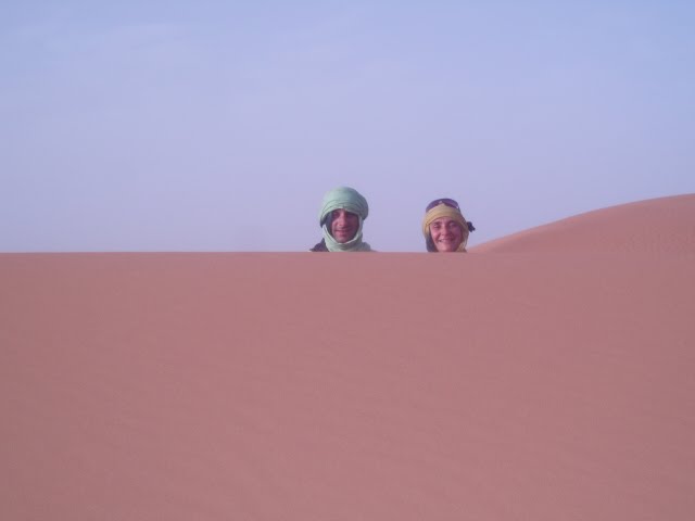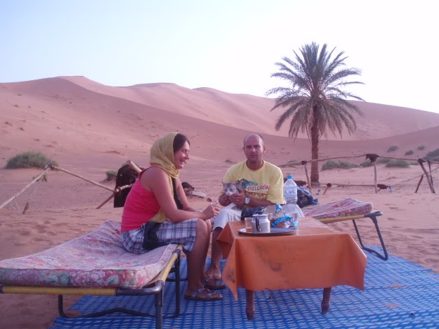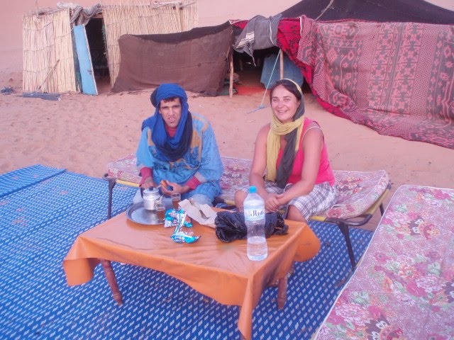 Čim smo došli u Merzougu, malo selo na rubu pustinje gdje Ali ima rođake koji drže malo svratište. Tamo smo dobili deve i Muhameda novog vodiča koji je s nama trebao provesti noć u pustinji. Zajahali smo deve i krenuli, al nije dugo prošlo kad je počela pješčana oluja i to takva da od pijeska nisi vidio prst pred nosom, srećom da nam je Ali kad je vidio da dolazi dovezao šalove pa smo se omotali ko pravi Berberi. Muhamed nas je vodio oko 2 i pol sata kroz pješčane nanose i već je pala noć, naravno ništa od spektakularnog zalaska sunca u pustinji, stvarno smo pehisti odemo jedamput u životu u pustinju i mazne nas oluja i kiša?! Al i to treba doživjeti. Ne moram ni pričati da je taj tripić a naročito noćenje u pustinji bilo highlight našeg putovanja, prava avantura, na devama 2 sata, spavanje pod vedrim nebom, tajine skuhana na plameniku, čaša vina, i hvala Bogu zvijezde jer se nebo na kraju kad smo stigli razvedrilo. U kampu smo našli mačku, koja nam se odmah uvalila, a Muhamed je razvukao poljske krevete na kojima smo spavali i rekao da će nas probuditi za izlazak sunca. Skroz uzbuđeni i umorni brzo smo zaspali. Po noći me probudilo neko tapkanje i koraci. shit, ukenjala sam se gledam al niš ne vidim. Brijem tapka mačka, al kaj hoda, mislim si da ih budim, i Tomo i Muhamed spavaju ko topovi, a ja se ne usudim ni pomaknut. Vrtim neke najgore scenarije; sad će nas netko zaštihat iz mraka i zakopat, i onda se malo smirim i odlučim da ionak niš nemogu, bolje da se smirim sigurno nije ništa, ma ko bi bio?! Sklapam oči,stiščem vjeđe da zaspim na silu, koraci se i dalje čuju, al niš se ne dešava, patim se naprežem da nekaj vidim, ništa. Dočekam tako jutro kad ono Jimmy Hendrixi i Omar( naše deve) koje je Muhamed zavezao 100 metara dalje oslobodile se po noći i došle skroz do nas – to su one hodale. Naravno lakne mi jer sam sretna i svjesna da ću živjeti još jedan dan. Budim Tomu jer sunce izlazi(dobro da nisam čekala da nas Muhamed probudi, vidla bi izlazak ko i zalazak) Penjemo se na dinu, jedva; kak je teško penjat se po pijesku, koma. Nadam se da u tom polumrku neću najahat na škorpiju il zmiju, valjda i oni spavaju. i napokon izlazak sunca, a u daljini iza dine još jedan kamp i ekipa se budi.