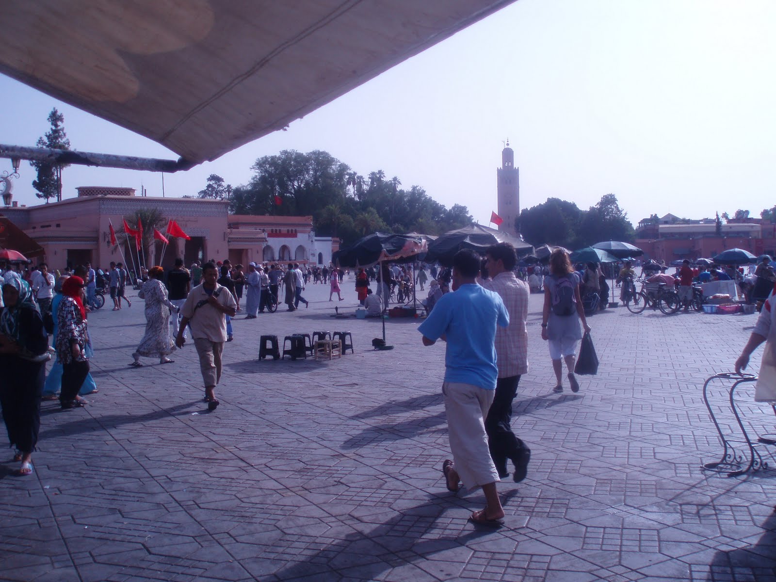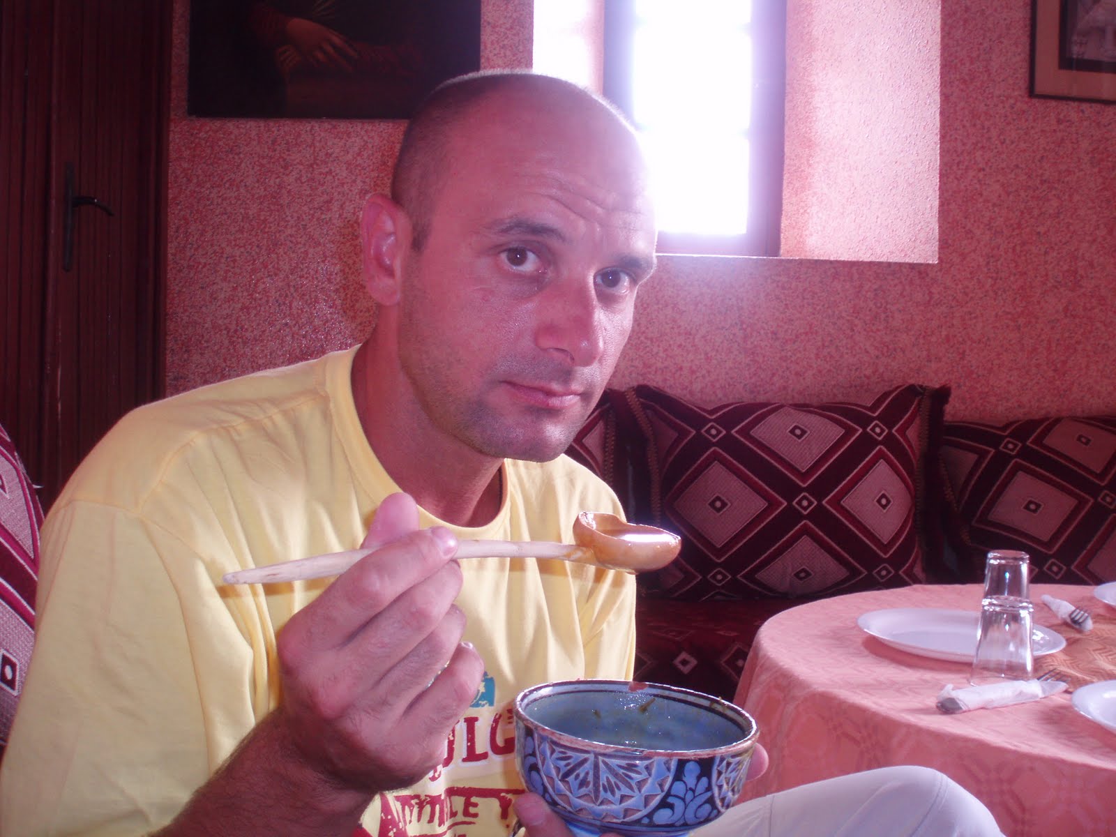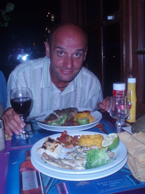 I ttakose mi uvalimo na neki bračni krevet na katu i lagana nirvana. Ujutro nas naravno u 5 ubije ona deračina s obližnjeg minareta i poziv na molitvu. Na to se ne navikneš ni nakon 8 dana. Odemo malo u okolicu izvidit situaciju, nađemo neku pekarnicu sa simpatičnom vlasnicom koja nam doručak naplati tak malo da nismo mogli vjerovat( naravno da nam je njezin muž to isto sutra naplatil, duplo skuplje, pa smo zaključili da je najbolje kupovat kod žena jer nisu kvarne:-) a frajeri bi ti ko turistu skinuli kožu.). Nakon finih peciva( rijetka dobra stvar koju su naslijedili od Francuza) popili smo kavu s našim domaćinom, bucmastim, rudlavim polu arapom polu francuzom, surferom koji nam je malo objasnilo što se događa i potvrdo da možemo ostat kolko hoćemo i kad odlazimo nek samo zalupimo vrata za sobom. To je gostoljubivost. Naravno da smo odmah pozvali, babe, tetke rodbinu, djecu da se svi uvalimo kad niš ne košta- zajebavam se al nije da nam nije palo na pamet da malo produžimo boravak, e da se mogla mijenjat karta za avion još bi sad tamo bili.