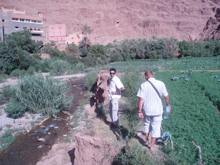 U Todra gorgesu smo prvo otišli na ručak gdje nas je uputio Ali i klopa je bila ok, a onda smo prošetali kroz kanjon, jedno stotinjak metara usjekla mala rijeka u crvene stijene. Lijep je krajolik al još je bolje bilo ufurat se u lokalnu ekipu koja je danas sva izašla ven jer im je bio neki praznik. Babci u feredžama razvukli dekice, vade paštete, klopu i cugu i uživaju na pikniku, klionci se brčkaju u vodi. Idila. Šetamo mi tako kad čujemo iza sebe ” A kaj sam ti rekla”. Mislim si, ovaj je svijet fakat mali, kaj ovi purgeri rade u ovoj vukojebini. Naravno odmah smo se bacili u priču sa simpatičnim parom i izmijenili iskustva. I dečko je popušio trovanje hranom, a ja sam ga skroz razumjela, iako je meni već bilo puno bolje. Pozdravili smo se s njima i krenuli put doline tisuću kashbi do Tinghira, male oaze prema jugu. Tu nas je Ali proveo po samoj oazi, po poljima uz rijeku, nije Bog zna kaj, oaza zvuči jako egzotično, a zapravo su to polja uz rijeku do kojih su iskopani kanali koji dovode vodu al doživljaj je bio potpun, tumaranje pokraj nasada paradajza, ispod palmi uz rijeku koja šumi. Na kraju smo završili kod nekog Alijevog rođe, na kavici u nekom pansionu s bazenom u kojem su valjda vodu promijenili za vrijeme prvog svjetskog rata, al mora se priznat pogled je super i kavica je dobra, i ljudi su ljubazni.