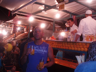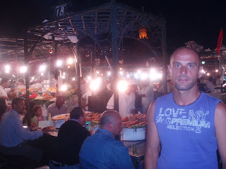 Prvi puta na trgu je bilo hrpa prodavača, pa onih koji sviraju zmijama(naravno kobrama), svirači, likovi s majmunima kojeg ti uvale na rame i za to ti naplate, uglavnom hrpa preformersa u arapskom stilu. Drugi puta navečer, ta sva ekipa nestaje i dolaze štandovi s klopom, kuhai, prodavači sokova i slastica i trg se pretvara u divovski rastoran a mirisi se šire na sve strane- od klope ima svega, ražnjića, povrća, neke super lokalne juhe za kunu porcija, kuhanih ovčjih glava u nekom saftu( meni izvrsnih i isto za bagatelu), puževa… Iako smo i te kako dobro znali da ne bi smjeli jesti hranu sa štandova radi trovanja hranom, ipak nas dvoje pravih poguzija i gladuša bezdušno se bacamo na svaki drugi štand gdje ima gužve i trpamo u sebe sve nabrojane oblizeke( drugi bi možda rekli gadosti, ali za nas su sve oblizeki, čak su i puževi ok). Najviše smo se navukli kod frajera koji je kuhao ovčje glave, kad smo se toga primili nismo mogli stat, jedino je na kraju onaj zafrkani slatkiš bio bezveze. Cijena hrane je bagatela ( osim onih turističkih navlakuša sa lijepo ukrašenim ražnjićima koji valjda stoje od Franje Josipa tamo), čajevi su skoro džabe, a najjebeniji su sokovi od iscijeđene naranče na koji smo se gadno navukli i nismo mogli proći kraj štanda da ne ubodemo bar jedan ( košta 2-3 kn, to je zemlja za mene). Nakon temeljitog prežderavanja, maznuli smo Coca Colu( još jedan dobar savjet sa foruma, to đubre ubija valjda sve bakterije i pomaže probavu, nezaobilazno nakon svakog obroka).