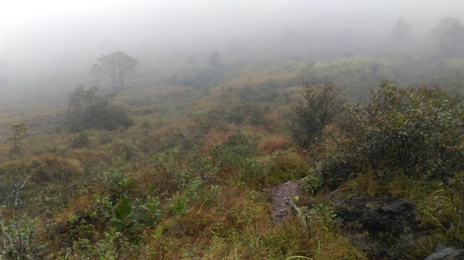 Sad vec mokri do koze penjemo se jos zadnjih 40 min, nistavse ne vidi, niti vulkan, ma skoro niti prst pred nosom, kolka je magla i kolko pljusti kisa. Vise uopce ni ne staje, pada non stop.