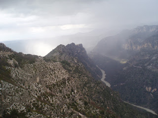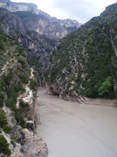 Konačna točka bio nam je Grand kanjon rijeke Verdon koja je urezala svoj tok u Male Alpe-Les Alpilles. Liči na američki kanjon pa otuda ime.Dug je 27 km a dubok 700 m. Rijeka koja je trebala biti tirkizno plava( fotke s interneta) bila je smeđa i nabujala jer nas je cijelo vrijeme pratilo nevrijeme. Naime kad smo došli blizu kanjona zbog sve veće nadmorske visine bilo je sve više oblaka- počela je padati tuča, sve krupnije i krupnije kuglice. Bilo je fucking freezing a uvjeti na cesti bili su zimski–5 cm leda. Al doživljaj je bio jebenitza!!!