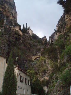 Al avantura tu još ne završava.Pošto nismo mogli dalje uz kanjon voziti otišli smo do sela Moustiers Sainte Marie, udaljenog par km od kanjona, izgrađenog u stijenama gdje se priča s Marijom Magdalenom nastavlja. Naime prije nego što je došla do biskupa Maximina skrivala se prema legendi u špilji iznad tog sela??!! Na tom je mjestu pored špilje izgrađena crkvica u 12 st.