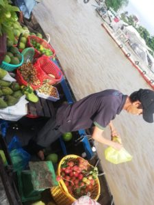 Krmeljava se izvlačim iz krevetca, zajašim motor i odem natrag u centar od kud mi kreće tura. Neka me baba od jučer navlači za rukav da idem s njom, a to mi prilično lupa na živce, jedva sam je se oterasila i našla svoju curku. Prvo nas je bilo samo dvoje na brodiću koji je pičio po rijeci, a onda su nam se prekrcali Vijetnamci s neke ture di im je vodička nekaj pričala na vijetnamskom što je meni bilo izuzetno zabavno, i još je na kraju zapjevala… Shit, đe me nađe. Plutajuća tržnica Cai Rang, koja je najveća tamo me malo razočarala, mislila sam da će bitti hrpa barčica, ali su uglavnom bili veći brodovi natovareni različitim povrćem, kupusom, krumpirima, ananasima…neki su tak bili puni da im je voda skoro ulazila u čamac. Nisam niš htjela kupovat, kaj bum s tim , moj suputnjk iz čamca ke kupio leeche pa me počastio. Dakje smo išli u neku tvornicu di rade male sušene ribice i žabice pa sam to malo isprobavala, i onda sjela u obližnju birtiju pojest neku rižicu i meso. Nahranila sam i cucka usput.. Poslije smo stali na nekoj plantaži mangosteena, malo džunglastoj, s puno stazica koje vode do nekog jezerca s lopočima. Usput su me neki vijetnamci turisti nahranili s mangosteenom. Zadnja je stanica tvornica rižinih rezanaca, di čak i ja kupujem rezance i neko sito za kuhanje na pari. Pored toga opet štandovi i mala tržnica di mi neki striček nudi sladoled, najfiniji, od kokosa i još nečeg, mljac. Tura je tipična turistička navlakuša di te furaju u prodavaonice na kraju, a zanimljivo mi je bilo da su Vijetnamci fakat sve pokupovali. Ne čine se siromašni baš, naročito ovi kaj putuju, a i ostali svugdje vidim sjede po restoranima i kafićima, stalno šopingiraju.