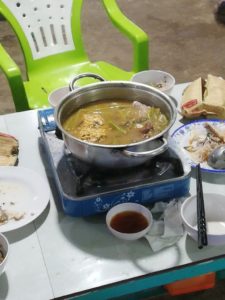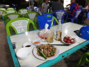 Predveče idem do An Thoia, ribarskog sela, nadajući se da ću pojesti neku ribicu, vozikam se okolo, opet market na cesti, pa luka, pa štandovi ali ne vidim neke riblje restorane, odustajem i vraćam se kad ono taman ugledam par restorana prek puta i čini se imaju ribu. Neka super curka kćer od gazde objasni mi kaj imaju sve i pokaže slikice i preporuči klopu. Prvo neke školjke i mprske puževe koji meni izgledaju ko prstaci prženi u voku s nekim fenomenalnim umakom , i onda neku ogromnu ribetinu na grilu, s kikirikijem i hrpom zelenjave i još mi je donijela neki hot pot kaj su oni jeli od ribe, i voće. Masakr od hrane, za 250 donga, a na noćnom marketu samo riba na grilu košta 250donga.